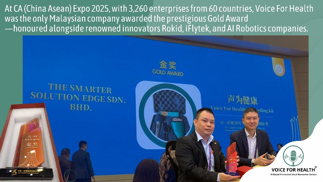 Voice For Health proudly represented Malaysia on the global stage at the CA (China-ASEAN) Expo, joining more than 3,260 enterprises from 60 countries. As the only Malaysian organisation to receive the prestigious Gold Award, Voice For Health stood alongside internationally recognised innovators such as Rokid, iFlytek, and AI Robotics. This honour reflects our unwavering commitment to innovation, technology-driven healthcare solutions, and advancing well-being across communities.